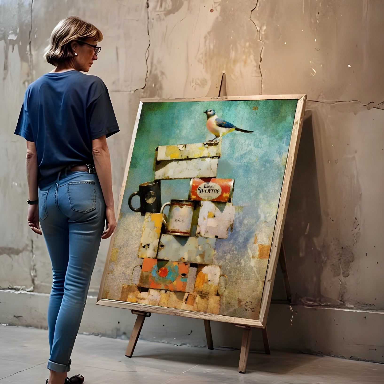 The blue bird perches atop a precariously balanced pile of debris. The bird feels safe because even if the heap of junk collapses, he can just fly away. The rest of us are not so fortunate!